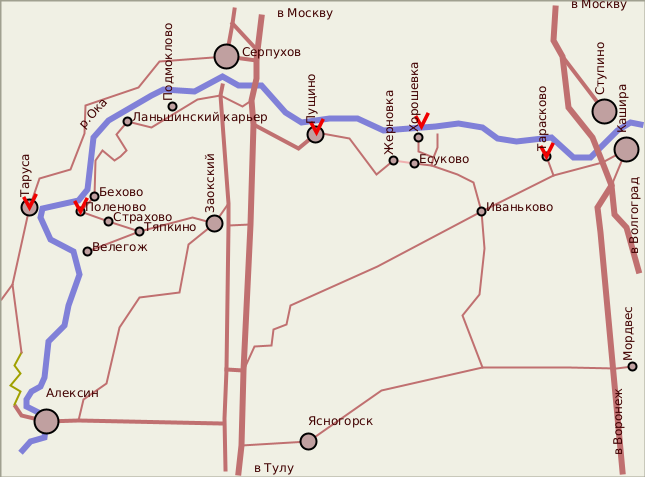Ока - одна из немногих рек Средней России, которая до сих пор течет в своих собственных берегах. На ней нет ни одной крупной плотины или ГЭС. Она счастливо избежала электрификации, каналостроения, поворотов вспять и прочих масштабных преобразований недавней эпохи. Может быть, поэтому ландшафт ее долины, спокойный и естественный, лишен того напрежения и неуютности, которые характерны, например, для большинства берегов Волги. Наконец, река просто красива. Высокий (очень высокий) правый берег - это край каменистого в своем основании плато. Ручейки, впадающие в реку справа, бегут по камням иногда почти как горные (кто бывал в Поленове, наверное, обратил на них внимание). Нередки каменоломни (в том числе и действующие), а из местного плитняка сложены порой довольно симпатичные сооружения ( усадебная ограда в том же Поленове). Левый берег иногда тоже высокий и крутой, в этих местах долина напоминает ущелье (Таруса, Велегож). Но обычно левобережье низкое, поднимается от реки широкими террасами - и тогда с высокого правого берега открываются далекие виды на уходящие за горизонт леса.