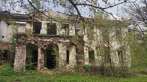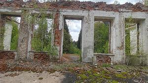 Дворовый фасад усадебного дома украшен трехарочным кирпичным портиком, потихоньку местность вокруг зарастает подлеском.