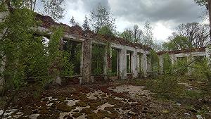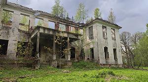 Оба флигеля вытянуты вдоль дороги. Ныне их украшают современные надписи, в том числе про рыночные отношения, приведшие к гибели местный дом отдыха.