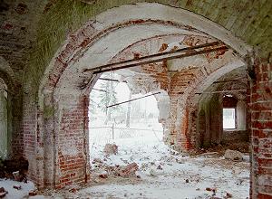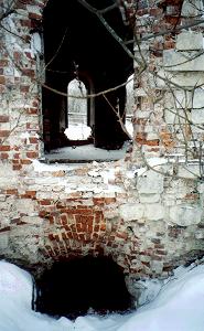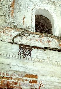 Арочные боковые входы, с двумя арками окон по бокам, превратились в один сплошной провал, грозящий обрушиться в любую минуту.