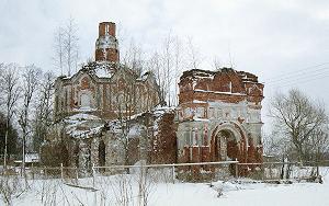 Немногое сохранилось от тех времен: остатки старого парка, да полуразрушенная Тихвинская церковь с частью колокольни. Церковь была построена в первой половине XVIII века, возобновлена в 1775 году и кардинально переделана в духе "национальной" архитектуры в 1864 году. Чуть позже, в 1880-х годах, была пристроена колокольня, сооруженная по проекту С.К.Родионова на средства А.А.Оболенской. Ныне от колокольни остался только первый ярус. Здания сложены из кирпича с применением для отделки белого камня. Несколько перегруженный нарядный декор включает мотивы XVII века. И сейчас выразительная церковь смотрелась еще эффектнее с завершением невысоким стропильным шатром и пощипцовым покрытием граней четверика.В основе композиции - небольшой храм типа "восьмерик на четверике" с отчетливой поперечной осью. Сводчатые перекрытия местами рухнули. Полуподвальная родовая усыпальница под трапезной в основном завалена. Состояние памятника не оставляет никаких надежд... А жаль, места здесь очень красивые. Вниз к реке спускается чудом уцелевшая старая березовая аллея. Бескрайние просторы, речная гладь, заброшенная вотчина могущественных когда-то князей Оболенских...