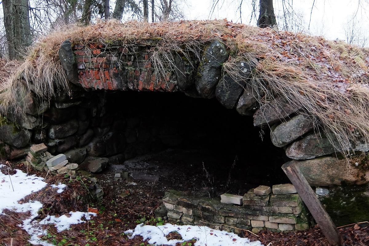 Между церковью и главным домом сохранились остатки погреба. Такие погреба, сложенные из валунов в распор, сохранились во многих окрестных усадьбах. Изначально конструкция была целиком каменной, кирпич добавили позже.