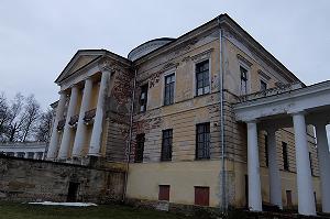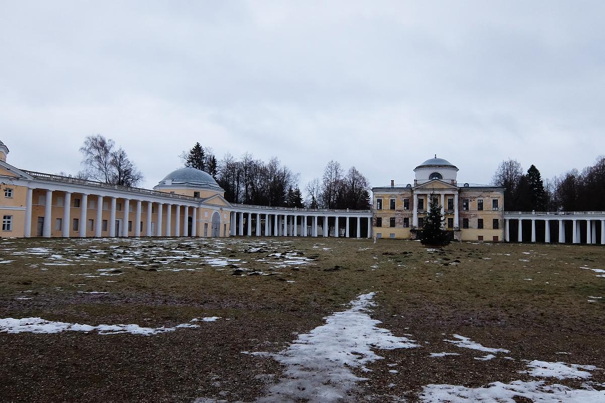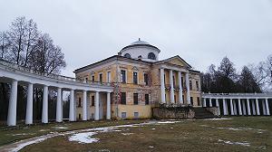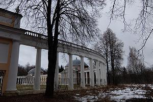Дворцово-парковый ансамбль находился в двух верстах от столбовой дороги Москва - Петербург. К главному дому вела подъездная аллея, завершавшаяся триумфальными воротами с элегантными каменными вазами на аттике.