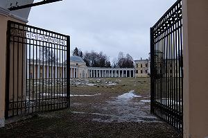 Овальный парадный двор со всех сторон окружен колоннадой, в которую были органично вплетены корпуса служебных построек.
