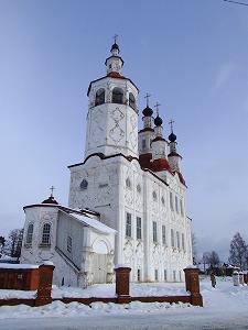 Немного истории. Первоначально (год основания - 1137) поселение располагалось ниже по течению Сухоны, но с появлением соляных варниц при впадении речек Ковда и Песья Деньга в Сухону, городок переместился на нынешнее место. В XVI веке посад Соль Тотемская был уже крупным населенным пунктом. Вываркой соли заправляли здесь Строгановы, при них городок обзавелся несколькими деревянными церквями. Крупным производителем соли был и расположенный рядом Спасо-Суморин монастырь (о нем отдельный сюжет на сайте). В повести о Феодосии Тотемском, написанной в 1550-х годах, сказано: "Переселяхуся людие из старого посада от варниц на берег Сухоны реки иде же ныне стоит город Тотьма". В это время строится кремль, торговые ряды, причалы для судов.Во временя опричнины Тотьма вошла в состав опричных земель, Иван Грозный побывал здесь несколько раз. Один из районов Тотьмы, где по преданию стояли царские шатры, до сих пор носит название Государев луг. В Смутное время жители города вначале целовали крест Лжедмитрию, но разобравшись в ситуации, отказались от крестного целования и послали свои полки для поддержки ополчения. После окончания польско-шведской интервенции в Тотьме была проведена перепись, по которой в городе насчитывалось 20 церквей, 199 дворов и 8 соляных варниц. Позднее жители города принимали активное участие в торговле с Англией, получив значительные льготы. Петр I не раз посещал Тотьму, изучал принцип работы соляных варниц, собственноручно вытаскивая бадьи с рассолом. Место понравилось царю и он стал ссылать сюда опальных бояр. Воеводой был посажен отец первой жены Петра - Ф.А.Лопухин. XVIII век стал временем расцвета для Тотьмы. Строились каменные храмы, дома, лавки, амбары. Этому косвенноспособствовал и пожар 1743 года, уничтоживший пол города. После чего был отстроен каменный Богоявленский собор (1744-1749). Он был капинально перестроен в духе раннего классицизма в 1816-1822 годах по проекту архитектора И.А.Фохта. А в 1863-1868 годах вновь подвергся перестройке по проекту ключаря вологодского Успенского собора П.В.Иконникова. В отличие от этого собора остальные церкви XVIII века сохранились почти без изменений. Определяют лицо города два стоящих недалеко друг от друга барочных храма: Входа в Иерусалим и Рождества Христова. Церковь Рождества Христова - действующая, а во Входоиерусалимской располагается музей мореходов. Тотьма славилась своими моряками. На средства местных купцов снаряжались экспедиции на Аляску (один из кораблей даже назывался "Тотьма"). Отсюда родом был и Иван Кусков, достигший берегов Америки в 1789 году, а в 1812 основавший русское поселение в Калифорнии - Форт-Росс. Знаменитый мореход похоронен на кладбище Спасо-Суморина монастыря. Рядом с Входоиерусалимским храмом не сразу замечаешь остатки церкви Иоанна Предтечи, построенной в 1738-1740 годах по заказу секретаря великоустюжской консистории И.Г.Фирсова. От XVIII века сохранились еще Воскресенская и Успенская церкви. Интересно здание присутственных мест, построенное в конце XVIII - начале XIX века. Богатая отделка придает ему какой-то вовсе не казеный вид. В 1780 году город получил статус уездного и герб.