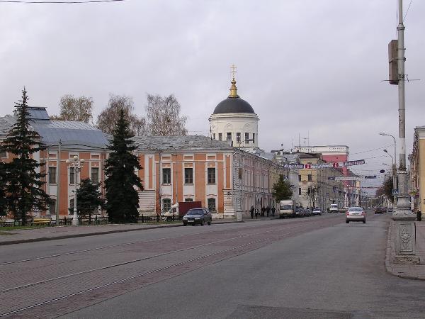 кварталы к югу от нее. Некоторые дома были надстроены, некоторые - снесены. Однако кое-что сохранилась и на этой улице, и в первую очередь - ансамбль Фонтанной площади (ныне площадь Ленина, на пересечении с Трехсвятской улицей), созданный в самом начале регулярной застройки Твери, в 1770-х годах (П.Р.Никитин, возможно, при участиии М.Ф.Казакова, проект создан еще 60-е годы). На ближнем плане - здание магистрата, одного из четырех зданий площади, имеющей форму восьмигранника. На дальнем плане видна Вознесенская церковь (И.Ф.Львов, 1826-1836).