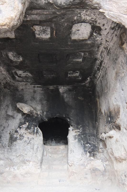 Венх одного из помещений украшают квадратные кессоны. Потолок и стены сильно закопчены. Невольно представляется картина огромного пожарища, но соседние залы не имеют таких следов, что довольно странно.