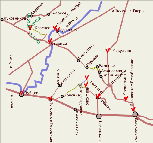 Проезд -по шоссе Москва-Рига. К древнему городищу и Успенскому собору на автомобиле можно попасть только переехав Волгу по по шоссе на Старицу (поворот на Старицу за пределами нашей схемы, дальше по шоссе в строну Риги).Однако лучше оставить автомобиль в современном центре города, например, около краеведческого музея,и прогуляться на левый берег по подвесному пешеходному мосту.